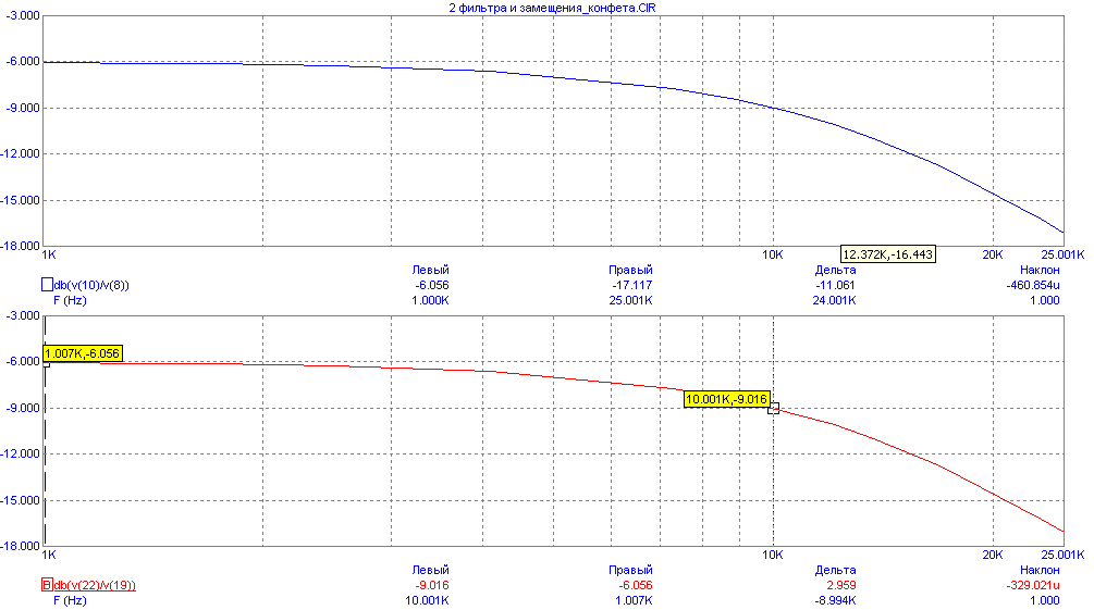 Спостерігається пониження напруги (-9.25Дб) на 2,76% від запланованого на частоті зрізу при підвищені значення резистора R6 , а при зменьщені значення опору R6 – підвищення (-8.75Дб) на 2.6%.