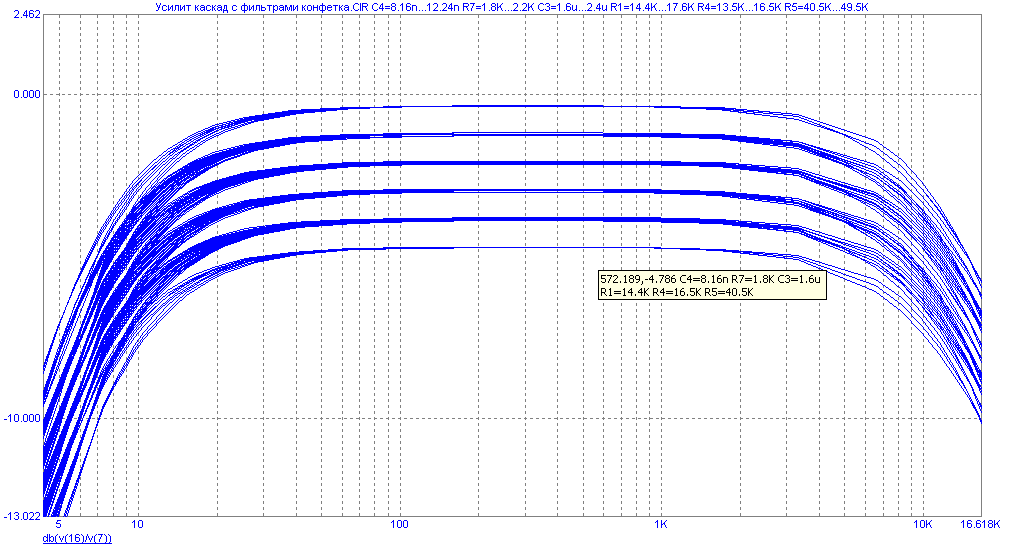 Тепер використовуємо багатоваріантний аналіз схеми (stepping). Багатоваріантний аналіз є процес варіювання різних параметрів схеми із заданим кроком для спостереження її реакції. Використовуємо шість параметрів, що змінюються. Це будуть R5,R4,R1,R7,C3,C4. Отриманий графік можемо використовувати для визначення впливу зносу компонентів на дану схему. Верхня і нижня межі показують можливі найсильніший знос компонентів, середина графіка - ідеальний випадок, тобто знос елементів відсутній.