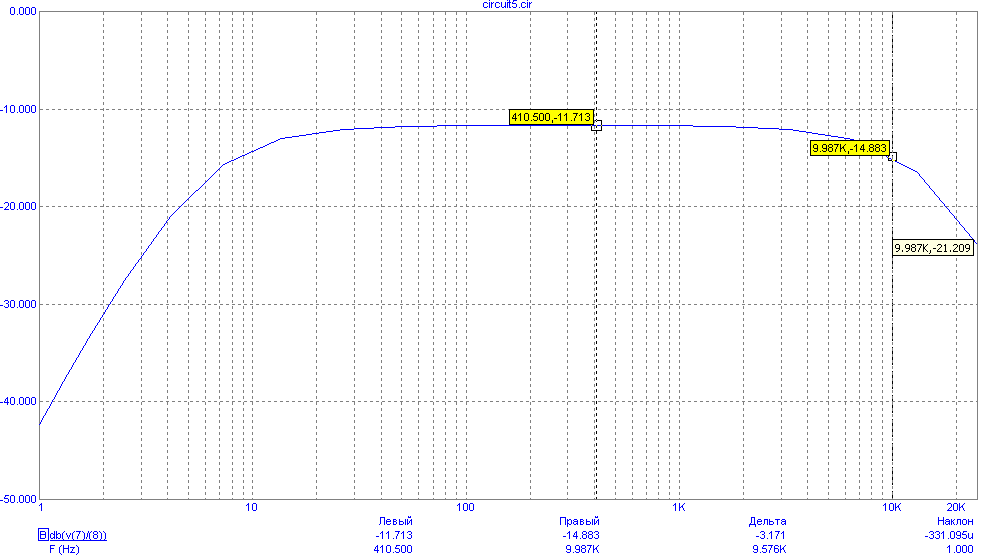 Видно, що коефіціент підсилення 3Дб відповідає частоті зрізу 10 кГц, що свідчить про вірність еквівалентної моделі.