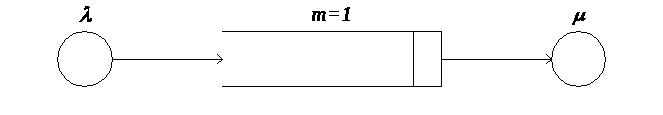 З отриманої концептуальної моделі було отримано схему взаємодії елементів даної системи обробки повідомлень від датчиків та вимірюючих пристроїв на ЕОМ . Побудована модель буде мати один процесор, який оброблятиме деяку чергу повідомлень від датчиків. Отже, припущення про те, що дану моніторингову систему процесу надходження і обробки повідомлень на ЕОМ у можна подати у вигляді одноканальної системи масового обслуговування (СМО), є підтвердженим. Так як у буферній пам'яті може бути не більше ніж одне повідомлення, то вказана СМО є СМО з обмеженою довжиною черги (рисунок 2).