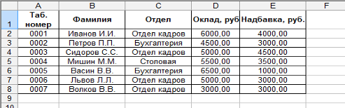Для получения результата в столбце «Сумма по окладу», используя функцию ПРОСМОТР(), по табельному номеру найти соответствующий оклад, разделить его на количество рабочих дней и умножить на количество отработанных дней. «Сумма по надбавке» считается аналогично. Данные берутся из графы «Надбавка» (для столбцов В, С, D, E, F, H, I выбрать Формат – Ячейки – Число – Денежный)