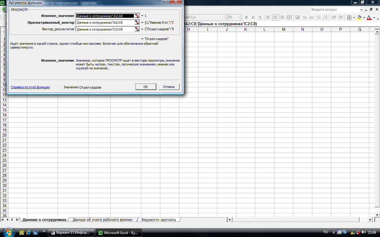 помещаем курсор мыши в ячейку D2 и вводим =ПРОСМОТР('Данные о сотрудниках'! A2: A8; 'Данные о сотрудниках'! A2: D8; 'Данные о сотрудниках'! D2: D8) /ПРОСМОТР('Данные о сотрудниках'! A2: A8; 'Данные об учете рабочего времен'! A11: B17; 'Данные об учете рабочего времен'! B11: B17) *ПРОСМОТР('Данные о сотрудниках'! A2: A8; 'Данные об учете рабочего времен'! A11: C17; 'Данные об учете рабочего времен'! C11: C17)