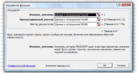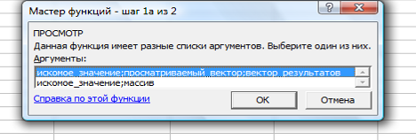 в появившемся окне Мастер функций – шаг 1а из 2 выбираем отметку искомое значение; просматриваемый вектор; вектор результатов
