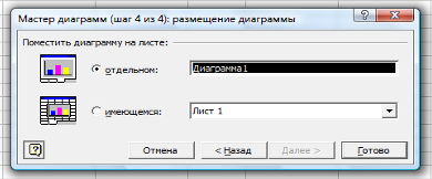 в появившемся окне Мастер диаграмм (шаг 4 из 4): источник данных диаграмм (рис.13) Поместить диаграмму на листе и выбрать Отдельном