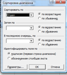 в появившемся окне в поле Сортировать по указать Отдел и Идентифицировать поля по подписям