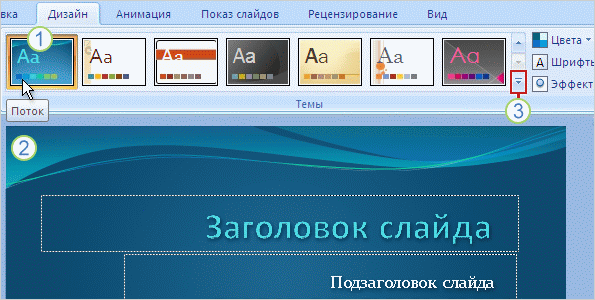 Чтобы увидеть, как будет выглядеть презентация, в начале работы необходимо выбрать Тему презентации, Рисунок 2. Тогда цвета темы будут применяться по мере добавления к слайду определенных объектов, например, диаграмм или таблиц.