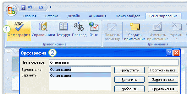 Настроить показ и опубликовать его в Интернет помогут вкладки Рецензирование, Рисунок 4, с помощью, которой можно проверять орфографию, пользоваться справочными материалами и тезаурусом, добавлять речевое сопровождение и создавать примечания к презентации, и Параметры PowerPoint, Рисунок 5, чтобы настроить параметры колонтитулов выбрать параметры, имеющие отношение ко всему приложению.