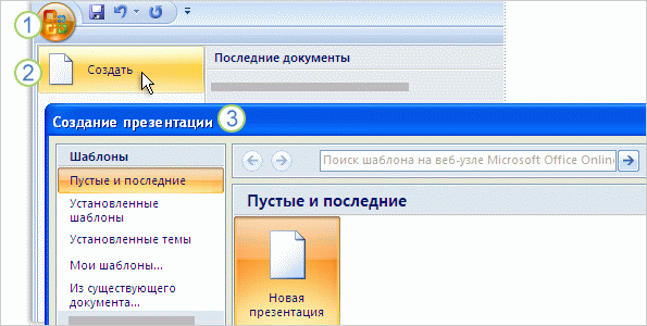 Создание новой презентации, начинается с кнопки Microsoft Office и выбора команды Создать, Рисунок 1. В окне Создать презентацию необходимо начать с пустого слайда либо создать презентацию на основе шаблона или существующей презентации.