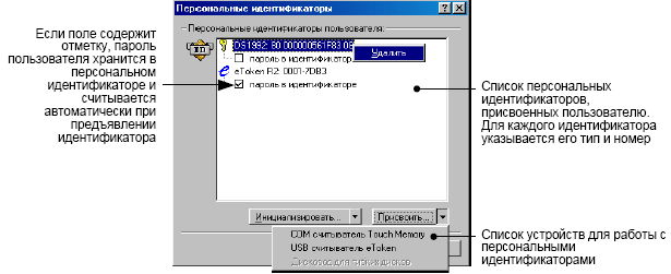 В группе полей «Персональные идентификаторы и пароль» нажать кнопку «Подробности». На экране появится диалог для управления персональными идентификаторами пользователя.