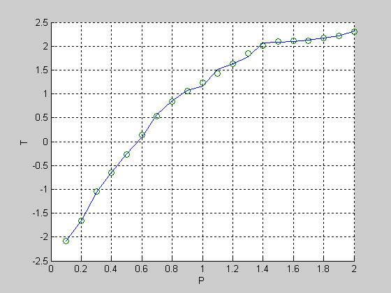 plot(P,T,P,y,'o'),grid;