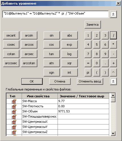 Рис. 14. Уравнение, использующее автоматически вычисляемый SolidWorks объем модели