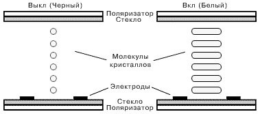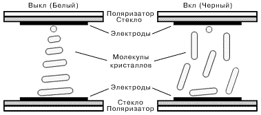 Если же применить напряжение (поле между двумя электродами), то оно уничтожит спиралевидную структуру кристалла. Молекулы выстроятся в направлении электрического поля. В нашем примере они станут перпендикулярны подложке. В данном положении свет не может пройти через субпиксели. Белая точка превращается в черную.
