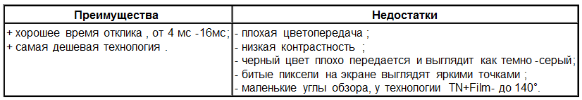 TN+Film решение не приводит к существенному увеличению времени отклика, однако, оно достаточно дешево и несколько увеличивает угол рассмотрения. На сегодняшний день эта технология имеет самое широкое распространение.