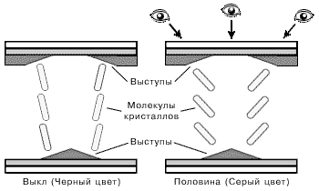 • Жидкие кристаллы не могут выстраиваться строго перпендикулярно подложке при включении напряжения. Именно по этой причине старые ЖК-дисплеи не могли отображать четкий черный цвет.