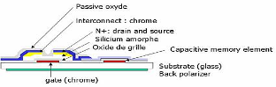 На стекло наносится слой хромовых проводников для создания проводящей структуры транзисторов и запоминающих конденсаторов. Затем добавляется тонкий слой оксида кремния, который будет работать в качестве диэлектрика для затворов транзисторов и конденсаторов. После этого для создания канала транзистора наносится слой аморфного кремния. Затем две зоны транзистора легируются N+ для создания стока и истока. Наконец, наносится слой металлических проводников, чтобы связать транзистор (слева) с запоминающим конденсатором (справа). Этот слой также обеспечивает подключение к металлической шине данных. Хромовая решётка, соединяющая все транзисторы в строчке, работает в качестве горизонтальной адресной линии. Наконец, весь комплекс покрывается оксидной плёнкой для защиты компонентов.