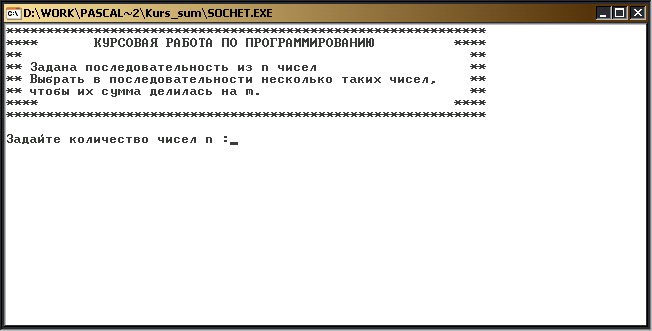 В курсовой работе создана программа, которая реализует выполнение следующих функций: ввод пользователем с клавиатуры последовательности целых чисел, поиск во введенной последовательности нескольких таких чисел, чтобы их сумма делилось на некоторое задаваемое пользователем число. Вывод результата осуществляется на экран монитора и дублируется в текстовый файл на жестком диске или внешнем накопителе. В первом разделе курсовой работы выполнен анализ технического задания, выделены функции, которыми должно обладать разрабатываемое приложение, а также сформулированы требования к нему, произведена постановка задачи на проектирование. Во втором разделе выполняется анализ задачи проектирования, анализируется вид исходных данных и приводится словесный алгоритм работы программы. В третьем разделе рассматриваются алгоритмы разработанных процедур и функций, а также приводятся их описания. К реализованной программе разработана инструкция пользователя, которая приведена в четвертом разделе. Алгоритмы процедур приведены в приложении А. Листинг программы содержится в приложении Б.
