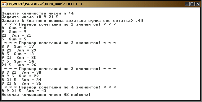 - определение сумм элементов в сочетаниях и вывод на экран последовательностей и полученных сумм;