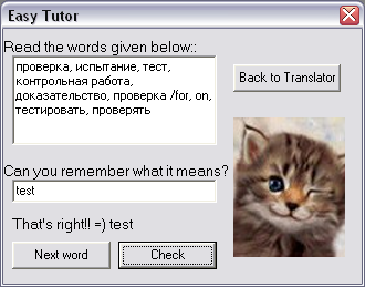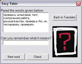 Приступить к работе с Tutor можно, нажав кнопку Tutor главного окна программы, закончить работу – нажав Back to Translator или красный крест.