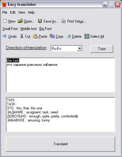 Так как данная задача относится к разделу обучающих программ, то, кроме собственно переводчика, в программу была включена дополнительная функция – Tutor («Учитель»), позволяющая проверить словарный запас пользователя и по возможности его расширить.