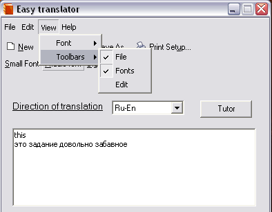 Пользователю доступны все разделы меню, поэтому можно открыть текстовый файл изменить содержимое текста, а потом сохранить или распечатать полученный пословный перевод. Некоторые разделы меню (например, Правка) представлены в виде панелей инструментов, которые можно отобразить или скрыть.