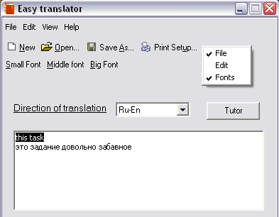 В программе предусмотрено стандартное меню, оснащённое горячими клавишами, что позволяет пользователю открывать текстовые файлы для перевода, сохранять и распечатывать перевод, а также редактировать текущий текст для перевода. Меню реализовано с помощью компонента ActionManager, с помощью которого легко создаются и реализуются разделы меню (по необходимости снабжённые горячими клавишами и встроенными диалогами), к которым могут быть привязаны иконки действий по индексу компонента Images (ImageList). Пользователь может менять внешний вид приложения, например, изменять размер шрифта. Также возможно скрывать или отображать панели инструментов (которые были созданы также с помощью ActionManager) – с помощью контекстного меню (компонент PopupTools – PopupMenu, реализация действий взята из ActionManager):