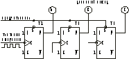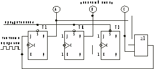 Рассмотрим схему 3 разрядного счетчика по модулю 8 (рис.13.4). Все синхронизирующие входы триггеров (C) соединены параллельно, тактовые импульсы поступают непосредственно на синхронизирующий вход каждого триггера.