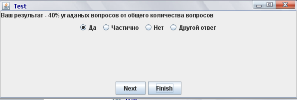 Class CheckBoxFrame – это класс, содержащий все элементы и свойства окна тестирование знаний, который отвечает за вывод информации из файла на экран, принятия информации пользователя, формулирования и вывод результатов на экран, а также их последующая запись в файл. Функция addRadioButton () – отвечает за добавления кнопки и элементов идентификации. Функция actionPerformed () – отвечает за чтение и сравнение информаций пользователя и конкретного задания.
