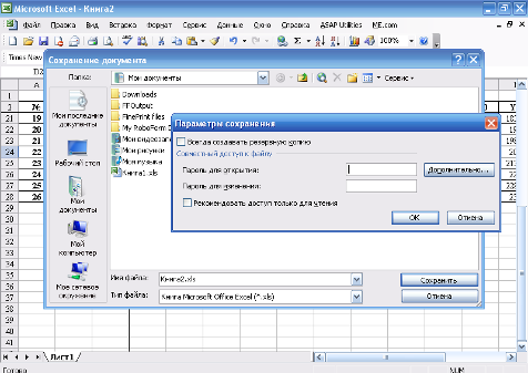 В диалоговом окне Сохранение документа, которое появилось, введите имя файла в соответственное окно и укажите путь к нему. Если нужно сохранить файл в другом формате, то в поле Тип файла укажите этот формат. При необходимости щелкните по кнопке Параметры. Появится диалоговое окно Параметры сохранения, в котором можно указать, всегда ли создавать резервную копию, или задать пароли для защиты информации в файле от несанкционированного доступа или для дачи разрешения вносить изменения в файл, или рекомендовать доступ только для чтения (внесенные в файл изменения сохранить в нем невозможно).