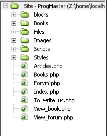 На рис. 3.3.2 зображено дерево проекту у якому відображаються всі файли, які були створенні під час створення проекту. В папочці bloks зберігаються файли, які відповідають за окремі частини сайту, оскільки сайт було розбито на блоки. Каталог Books містить власне файли книжок, які доступні для скачування. У папці Files – файли скріптів, які використовувалися для обробки даних. Вітка Imsges – всі зображення, які використовуються в проекті. Каталог script – файл із скріптами, які перевіряють правильність введення інформації у форми. У папочці style – каскадні таблиці стилів. Інші файли, які не ввійшли ні в одну із вище згаданих папок – власне сторінки сайту.
