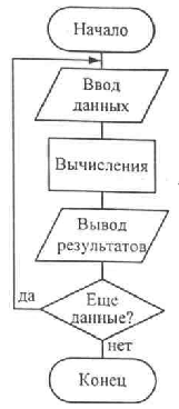Консольным называют интерфейс, который организует взаимодействие с пользователем на основе последовательного ввода и вывода информации в текстовом режиме по принципу «вопрос-ответ». Обычно такой интерфейс реализует конкретный сценарий работы, например: ввод данных – решение задачи – вывод результата (рис. 2, а). Единственное отклонение от последовательного процесса, которое обеспечивается данным интерфейсом, заключается в организации цикла для обработки нескольких наборов данных (рис. 2, б). Подобные интерфейсы в настоящее время используют только в процессе обучения программированию или в тех случаях, когда вся программа реализует одну функцию, например, в некоторых системных утилитах.