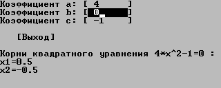 Интерфейс данной программы состоит из трех полей ввода для коэффициентов a, b, c и кнопки «Выход». Пользователь может вводить значения в поля в произвольном порядке. После ввода значения программа автоматически пересчитывает корни квадратного уравнения и обновляет информацию на экране. Текущий элемент управления (поле ввода или кнопка) подсвечивается, как это принято во всех системах, допускающих навигацию с использованием клавиатуры.