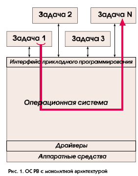 По своей внутренней архитектуре ОС РВ можно условно разделить на монолитные ОС, ОС на основе микроядра и объектно-ориентированные ОС. Графически различия в этих подходах иллюстрируются рисунками 1, 2, 3. Преимущества и недостатки различных архитектур достаточно очевидны, поэтому подробно мы на них останавливаться не будем.