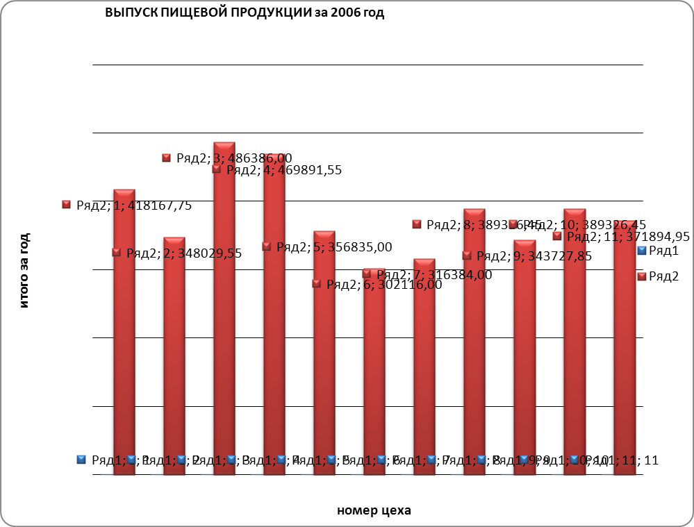 Выбираем команду диаграмма из меню вставка. В диалоговом окне команды диаграмма выбираем тип – гистограмма, вид – гистограмма с группировкой. Далее выбираем макет № 10, где по умолчанию устанавливаются автоматически диапазон выделенных данных и ряды: легенда устанавливается автоматически слева, а подпись данных у вершин внутри. Устанавливаем название осей: меню вставка – работа с диаграммами – макет – название осей – название основной горизонтальной оси – под осью – номер цеха, название основной вертикальной оси – повёрнутое название – итого за год. Выбираем стиль гистограммы - стиль 26. Увеличиваем размер гистограммы, нажатием левой кнопки мыши за правый верхний угол, растягиваем гистограмму вверх и вправо, а за нижний верхний угол растягиваем вниз и влево.