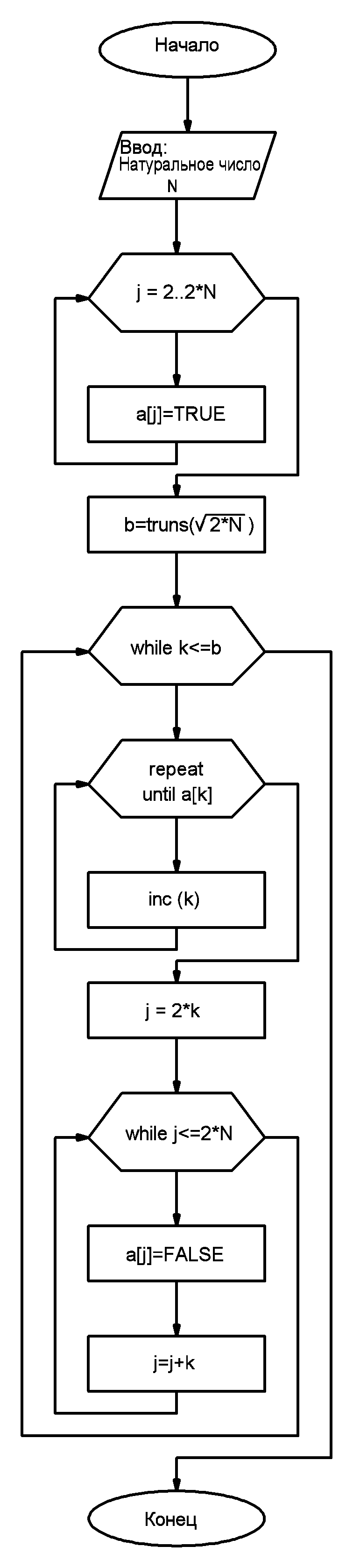 Кроме общих переменных заданных в программе в процедуре используются внутренние переменные b, k типа данных word. Задаем диапазон, на котором будем выделять простые числа. Далее создаем цикл: for j:=2 to 2*N do, в котором всем значениям массива а присваиваем значение TRUE. С помощью нескольких циклов в цикле: while k<=b do, всем не простым числам в массиве а присваиваются значения FALSE.