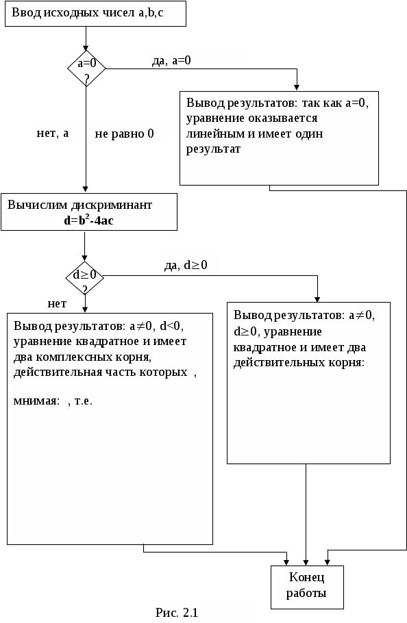 2. Разработка алгоритма решения задачи. Здесь возможно описание алгоритма в любой удобной форме: либо в виде словесного описания с включением формул, либо в виде блок-схем, что особенно наглядно и удобно. например, блок-схема алгоритма, исследующего квадратное уравнение ax2+bx+c=0, показана на рис. 2.1.