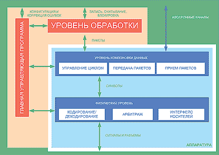 Функциональная схема интерфейса Firewire показана на рис. 1. Здесь внизу находится физический уровень, на котором происходит перевод стыкуемых мультимедийных сигналов в компьютерные форматы или, наоборот, с формированием, кодированием/декодированием и арбитражем, определяющим, в каком порядке устройства Firewire, составляющие сеть, могут работать.