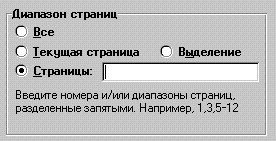 Радиокнопка (рис.1.6) как элемент управления окна в некотором роде близка переключателю. Этот элемент также имеет всего два состояния: включен/выключен. Принципиальное отличие от переключателей состоит в том, что радиокнопки, как правило, используются только группами. При этом включение одной радиокнопки в группе приводит к автоматическому выключению всех других кнопок этой группы. Иначе говоря, все радиокнопки в группе взаимозависимы. Так например, включение кнопки “Все” на рис.1.6 автоматически выключит кнопку “Страницы”. Управление радиокнопками осуществляется аналогично управлению переключателями, за исключением того, что передача фокуса от одной кнопки к другой осуществляется не клавишей Tab, а клавишами-стрелками.