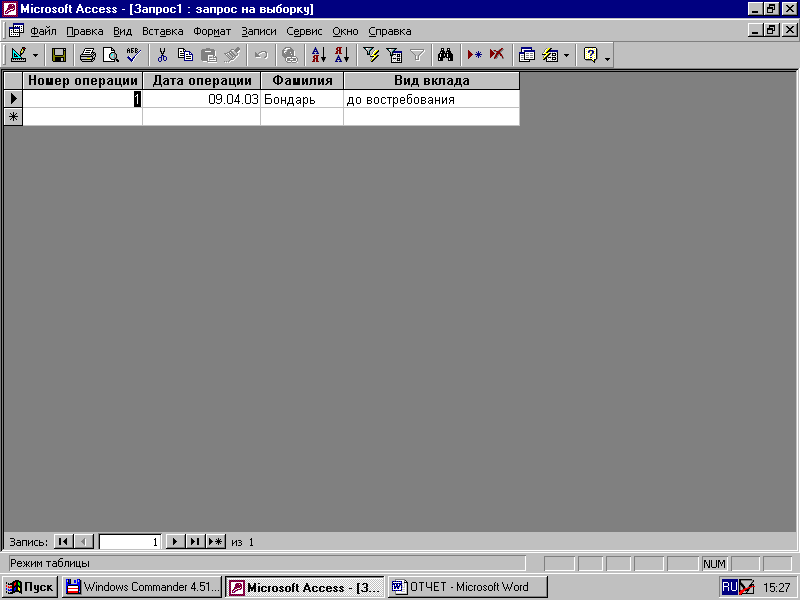Цель работы: изучение панели инструментов, работы с меню, окон таблицы, запроса, формы, отчета, справочной системы.