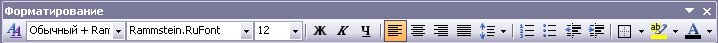 Панель «Форматирование» (рис. 4) обычно располагается под «Стандартной» панелью. Она содержит элементы для редактирования непосредственно текста: параметры шрифта, размер, цвет, выравнивание, режимы списка (маркированный, нумерованный и т.п.), обводка границ текста.