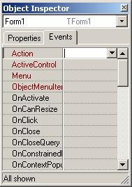 Сторінка подій (events) складає другу частину інспектора об'єктів (рис. 6. б). На ній вказані всі події, на які може реагувати вибраний об'єкт. Для того, щоб додати обробник подій, потрібно вибрати на формі за допомогою миші компонент, якому необхідний обробник подій, потім відкрити сторінку подій інспектора об'єктів і двічі натиснути лівою клавішею миші на колонці значень поряд з подією, щоб примусити C++ Builder згенерувати прототип обробника подій і показати його в редакторі коду. При цьому автоматично генерується текст порожньої функції, і редактор відкривається в тому місці, де слід вводити код. Далі потрібно ввести код, який повинен виконуватися при настанні події.