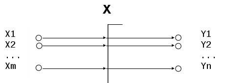 Функции входного и выходного выбора R1 и R2 будут записываться в форме условных выражений МакКарти. При этом для записи оператора импликации используется символ стрелки –>. Слева от этого символа записывается некоторый предикат, а справа, в угловых скобках – множество входных (для функции R1) или выходных (для функции R2) позиций. Предикат T представляет собой тождественно истинное высказывание.