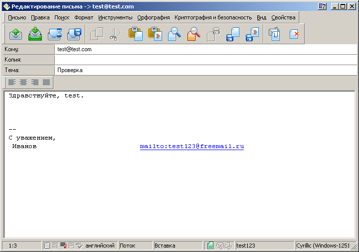 2. В поле «Кому» указываем test@test.com, в поле «Тема» - тему письма (например, «Проверка»), в области для текста письма набираем с клавиатуры сообщение для адресата.