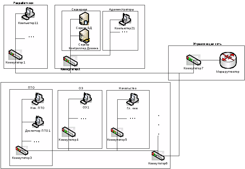 Отделы подключены в отдельный VLAN с помощью Коммутатора6 т.к. они работают с одним набором данных, а также для разграничения сетевого трафика между другими элементами сети. Рассмотрим данный сегмент более подробно. Производственно-технический отдел (ПТО) подключен к Коммутатору3. Отдел эксплуатации (ОЭ) подключен к Коммутатору4. Начальство, в том числе и главный инженер, подключено к Коммутатору5.