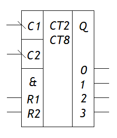 Содержит два независимых делителя: на два и на восемь. Для образования делителя на шестнадцать выход Q0 соединяют с входом C2. Счет ведется в натуральном двоичном коде. Счет происходит по отрицательным фронтам сигналов C1 и C2. Асинхронное обнуление наступает при R1=R2=1.