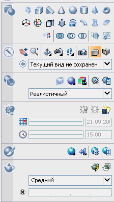 View — команды управления экраном, панорамирования, установки точки зрения, удаления невидимых линий, закраски, тонирования, управления параметрами дисплея; установка необходимых панелей инструментов;