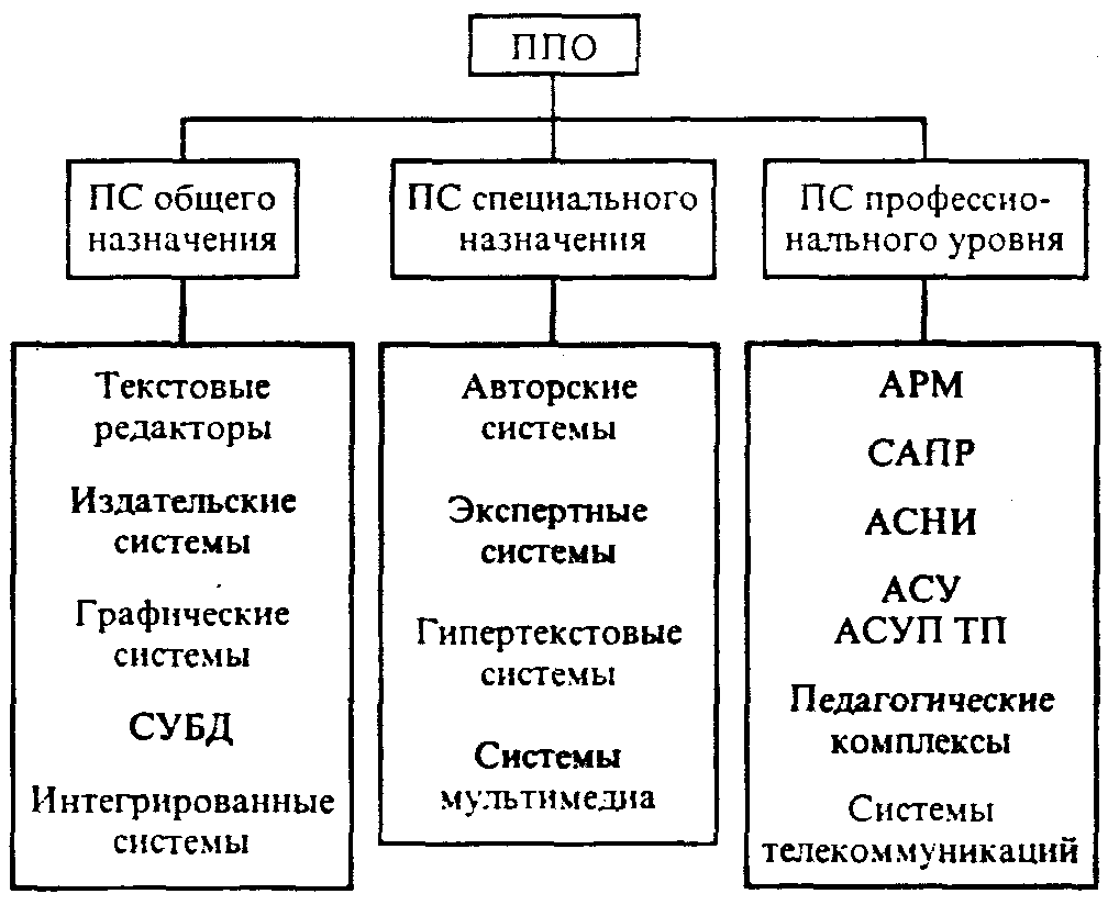 Один из возможных вариантов классификации программных средств (ПС), составляющих прикладное программное обеспечение (ППО), отражен ( на рис.1). Как и почти всякая классификация, приведенная на рисунке не является единственно возможной. В ней представлены даже не все виды прикладных программ. Тем не менее, использование классификации полезно для создания общего представления о ППО.
