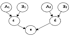 Рассмотрим пример сети (рис.1), в которой вероятность пребывания вершины «e» в различных состояниях (ek) зависит от состояний (ci , dj) вершин «c» и «d» и определяется выражением: