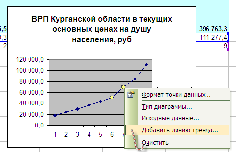 Если щелкнуть правой клавишей мыши по одному из маркеров, появится список, в котором нас интересует функция "Добавить линию тренда".