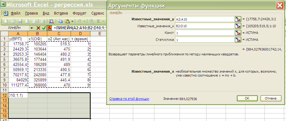 Для этого используем функцию "линейн" (рисунок 6), выделив свободную область в Excel в пять строк и в четыре столбца (b, m>1>, m>2>, m>3>).