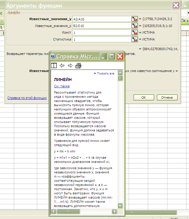 Читать получившийся результат нужно с права на лево. Для прочтения всей информации необходимо обратиться к функции "линейн" еще раз и вызвать "справку по этой функции" (рисунок 7).